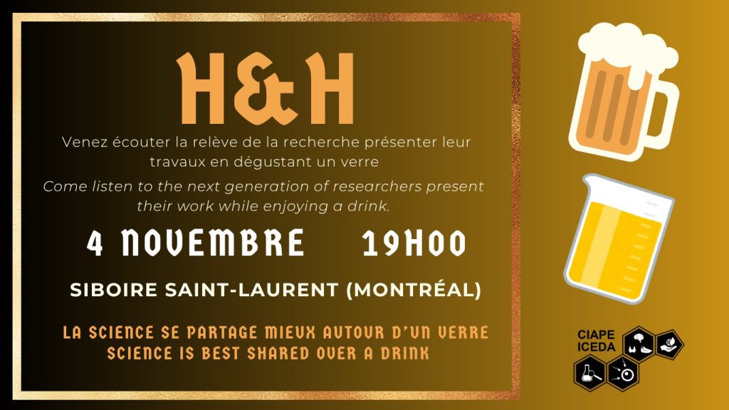 44 novembre 2025●(1 évènement) 7:00 pm: Soirée de vulgarisation scientifique sur les Perturbateurs endocriniens / Science Outreach Evening on Endocrine Disruptors – ![]() Le comité de la relève du CIAPE vous invite à une soirée conviviale et festive dédiée à la vulgarisation scientifique autour du thème des perturbateurs endocriniens. 🍷 Venez écouter les jeunes chercheur·e·s présenter leurs travaux tout en dégustant un verre ! 📍 Lieu : Montréal The CIAPE Early Career Committee invites you to a friendly and festive evening of science outreach focused on endocrine disruptors. 🍷 Come hear emerging researchers present their work while enjoying a drink! 📍 Location: Montreal Siboire Saint-Laurent |